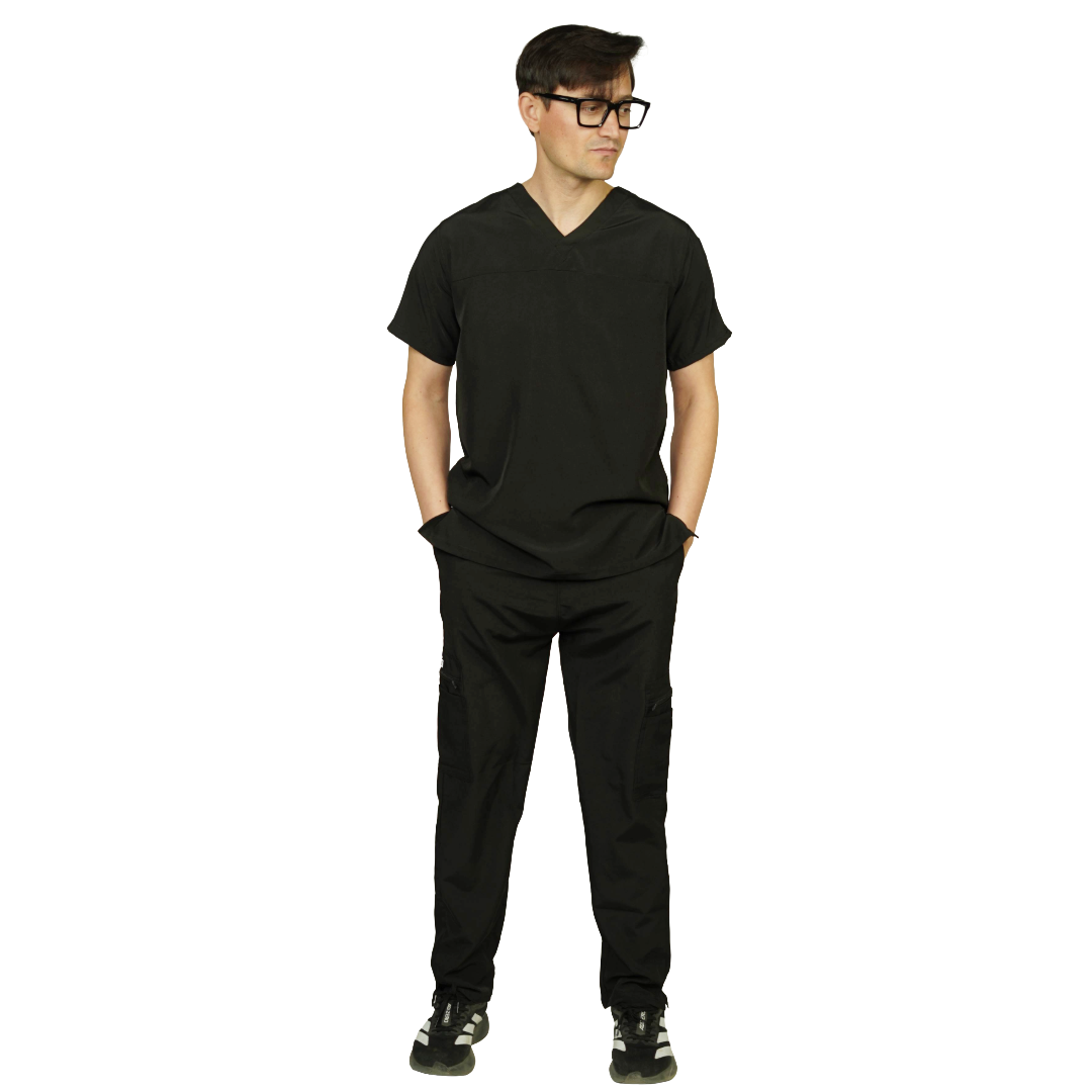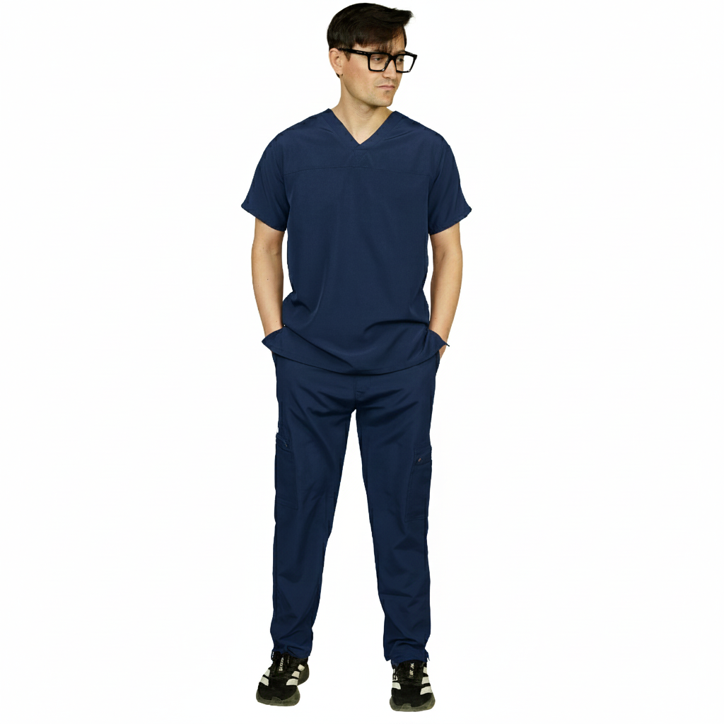 The trousers are designed in a cargo style with 2.5-inch slit ends, delivering a modern finish and enhanced movement. An adjustable elastic waistband ensures a secure and comfortable fit, while six fully functional pockets provide ample storage for daily essentials, making these scrubs ideal for hospital, clinic, and home care settings.