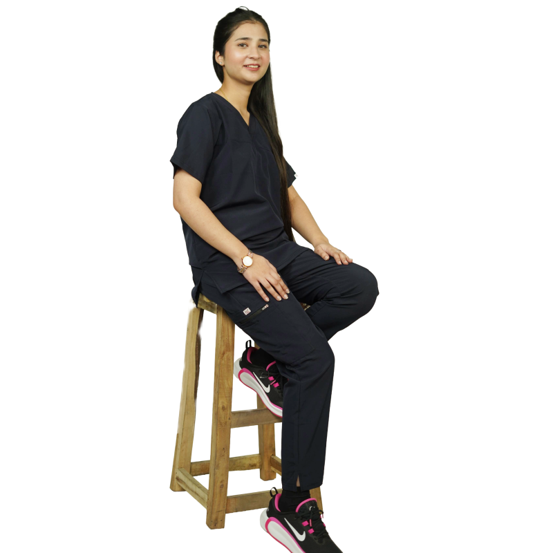 The trousers are designed in a cargo style with 2.5-inch slit ends, delivering a modern finish and enhanced movement. An adjustable elastic waistband ensures a secure and comfortable fit, while six fully functional pockets provide ample storage for daily essentials, making these scrubs ideal for hospital, clinic, and home care settings.