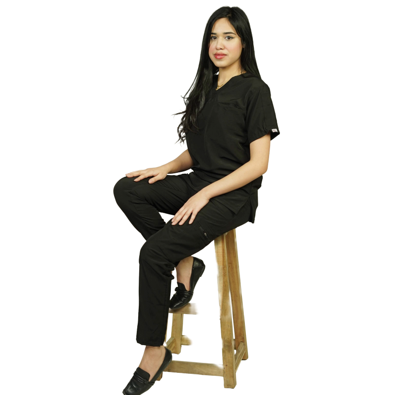 The trousers are designed in a cargo style with 2.5-inch slit ends, delivering a modern finish and enhanced movement. An adjustable elastic waistband ensures a secure and comfortable fit, while six fully functional pockets provide ample storage for daily essentials, making these scrubs ideal for hospital, clinic, and home care settings.